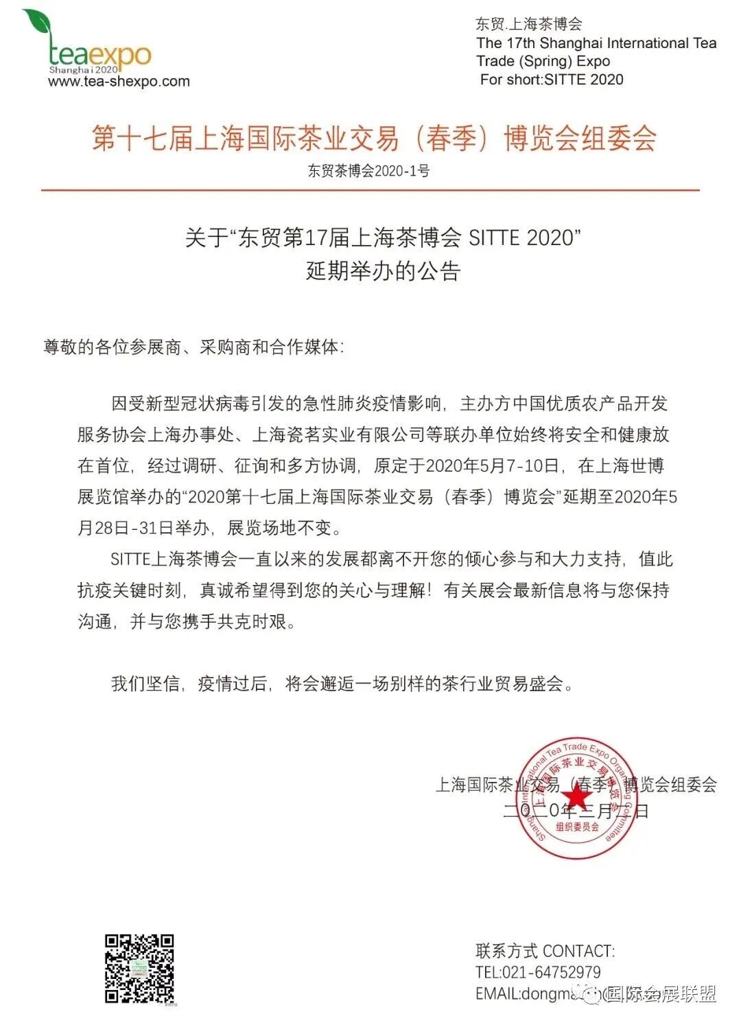 3月2日,东贸·上海茶博会正式官宣:原定于2020年5月7-10日,在上海世博展览馆举办的“2020第十七届上海国际茶业交易(春季)博览会”延期至2020年5月28-31日举办,展览场地不变。