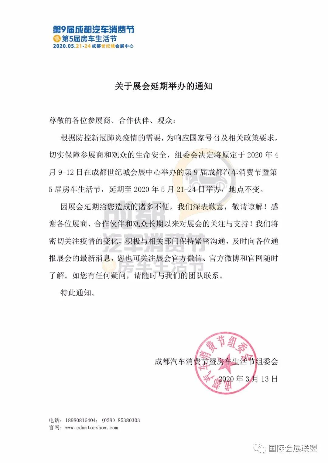 3月12日,成都汽车消费节组委会通知:决定将原定于2020年4月9-12日在成都世纪城会展中心举办的第9届成都汽车消费节暨第5届房车生活节,延期至2020年5月21-24日举办,地点不变。