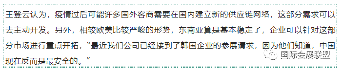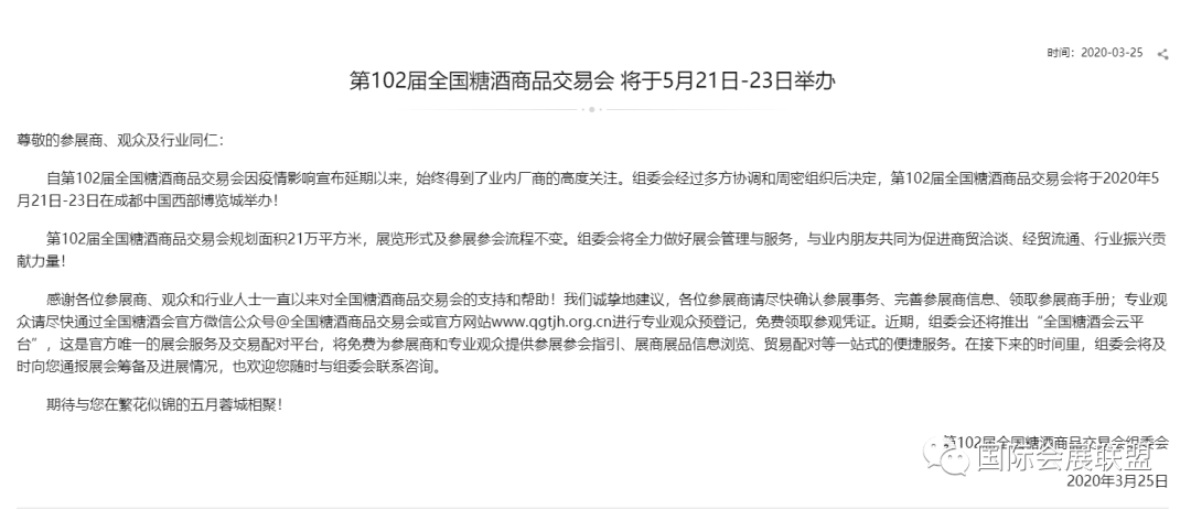 3月25日,第102届全国糖酒商品交易会组委会发布消息,今年全国春糖会定于5月21日-23日在成都中国西部国际博览城举办,规划面积21万平方米,参展参会流程不变,并推出“全国糖酒会云平台”。 3月31日,长沙市召开新闻发布会,发布首批包括2020湖南汽车展览会、2020长沙国际工程机械市场交易大会、2020中国(长沙)自然公园国际博览会、2020春季中国高等教育博览会等十大大型展览项目。 据悉,CEE第六届杭州国际跨境电商博览会将如期举行,近期还释放好消息,展出面积已突破30000平方米。 这场疫情吓退了80%的企业参展,但是还是有20%的企业选择参展去获取80%的客户资源,去喝得“头啖汤”。在你还在观望、犹豫不决的时候,你的同行已经开始抢占先机了。虽然受此次疫情造成的损失无法避免,但是在新出台的各项会展鼓励政策,如放宽金融、减费降税、奖励补贴等,对会展业重振也是相当利好。 |