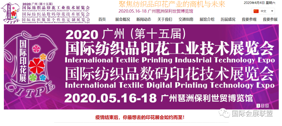 3月9日,国际印花展官方公众号发布文章《疫情结束后,你最想去的印花展会如约而至!》。文章中明确表示:2020年5月16日——18日,广州琶洲保利世贸博览馆1/2号展馆,纺织品印花行业专业盛会——广州国际纺织品印花工业技术展览会将如期举行。