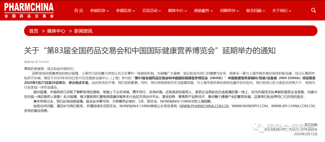 2月12日,国药励展宣布原定于今年4月8-10日在国家会展中心(上海)举办的“第83届全国药品交易会(简称“药交会”)、中国国际健康营养博览会(NHNE)和中国健康营养原辅料/包装/设备展(NHi China)”将延期于5月27-29日举办,举办地点不变。