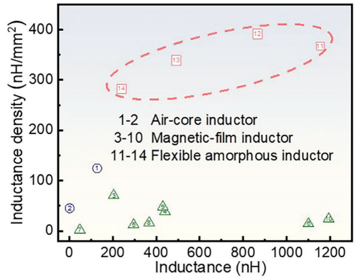 图3 柔性非晶电感器与文献报道其他类型电感器的的电感值及电感密度对比图